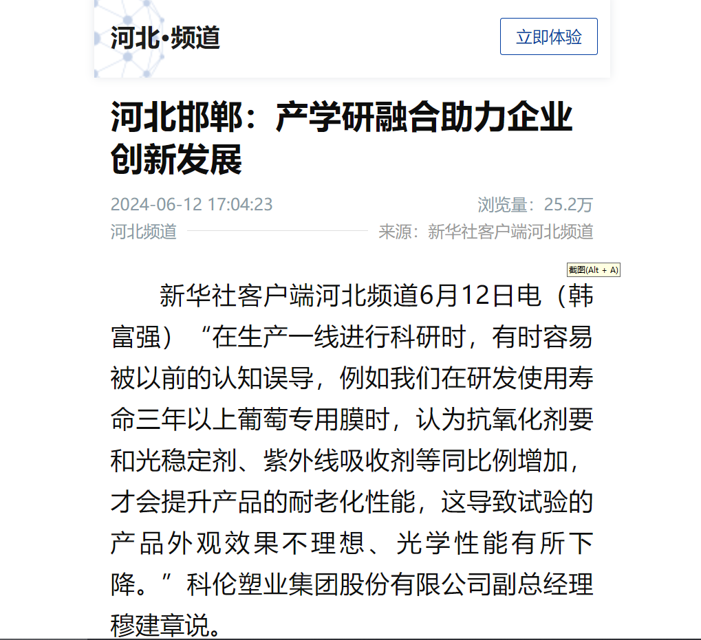 科倫塑業(yè)集團(tuán)股份有限公司于2024年6月12日就公司成長歷程、產(chǎn)學(xué)研融合助力企業(yè)創(chuàng)新發(fā)展方面,公司副總經(jīng)理穆建章接受新華社河北分社采訪,報道詳情如下